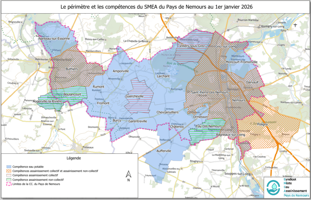 Le tableau suivant détaille les 24 collectivités adhérentes, ainsi que les compétences à la carte transférées au Syndicat Mixte de l’Eau et de l’Assainissement du Pays de Nemours (SMEAPN) :